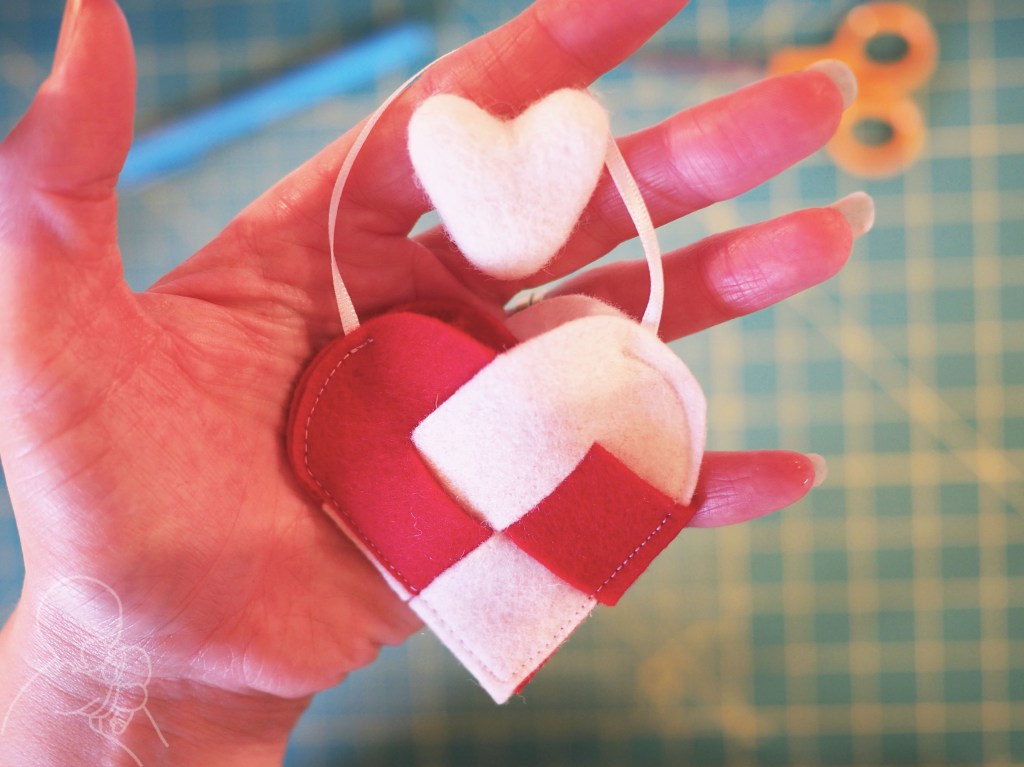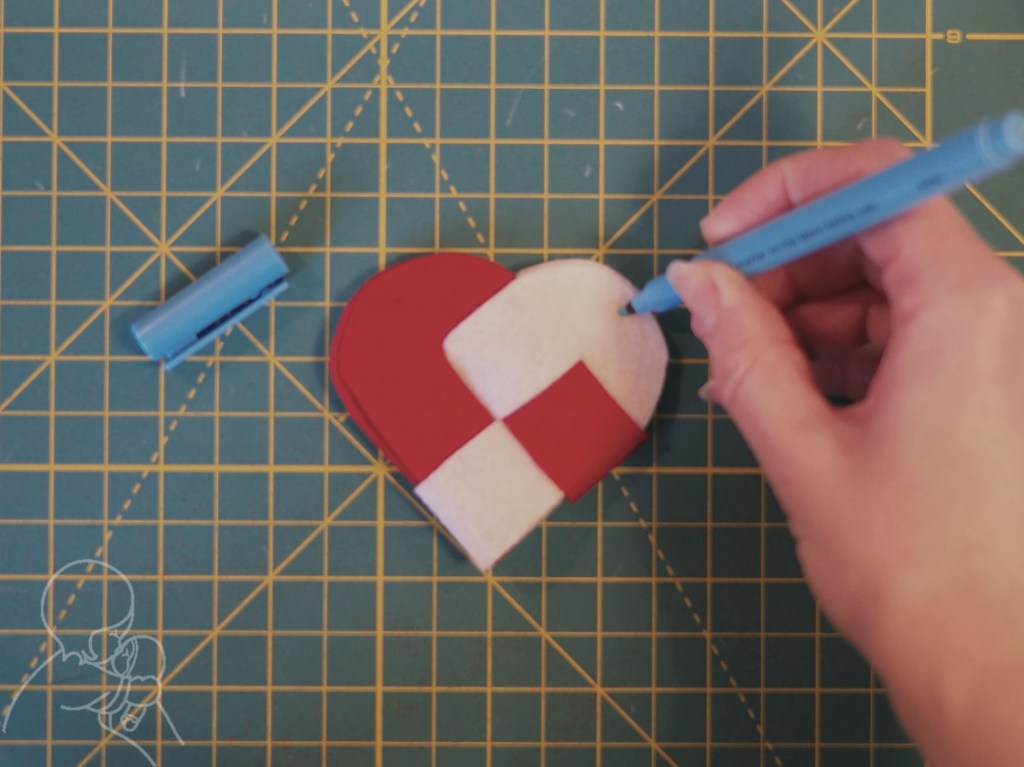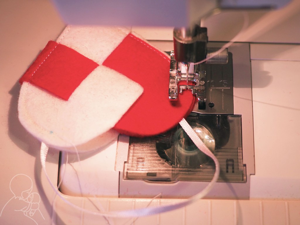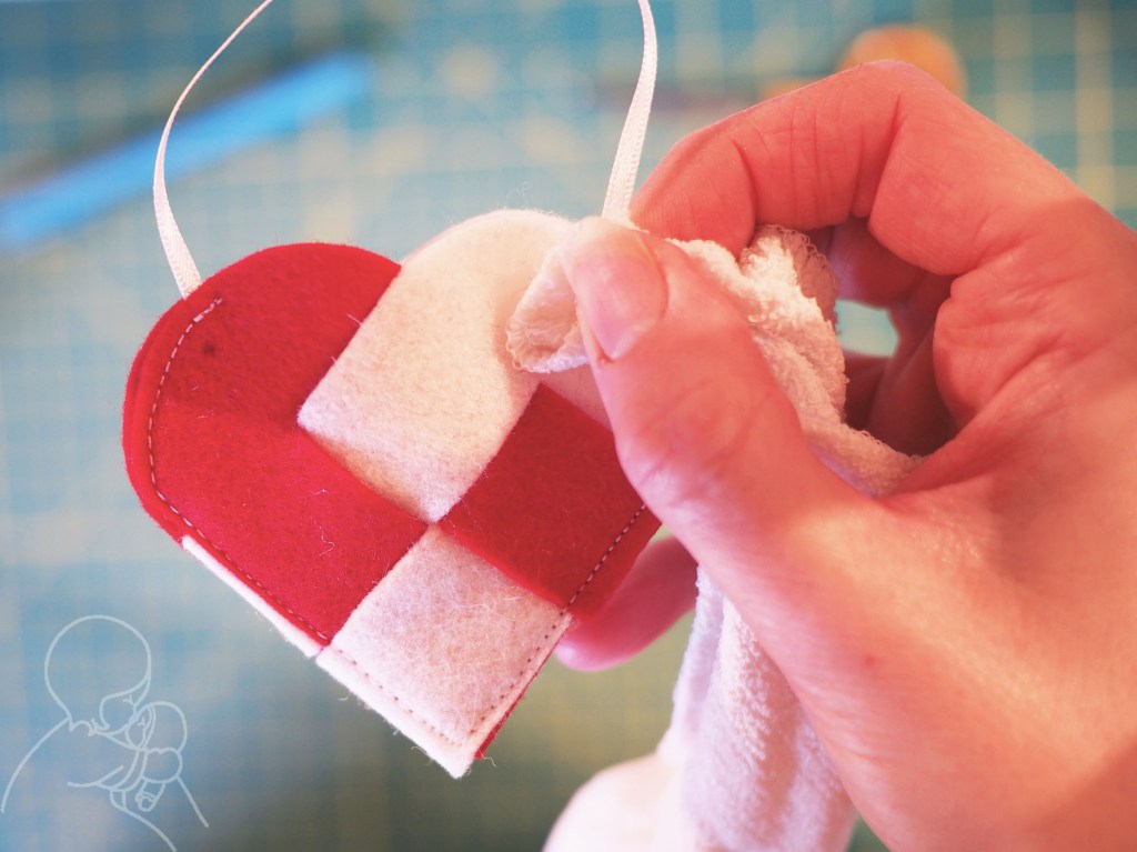 Using the straight stitch of a sewing machine, or a running stitch by hand, stitch around heart securely fastening the ribbon handle at either end, and ensuring that the woven heart is secure for play. Take care not to twist the ribbon.