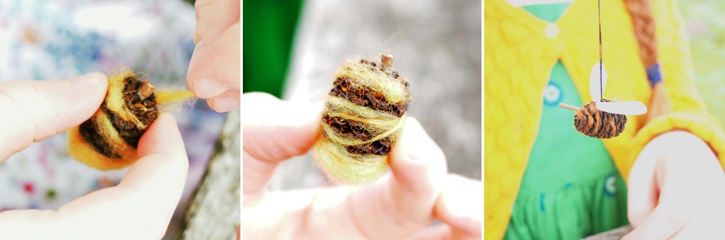 We collected Alder cones off the ground on our dog walk. They are perfect as they are round like a bee and tiny – but any cone can work.