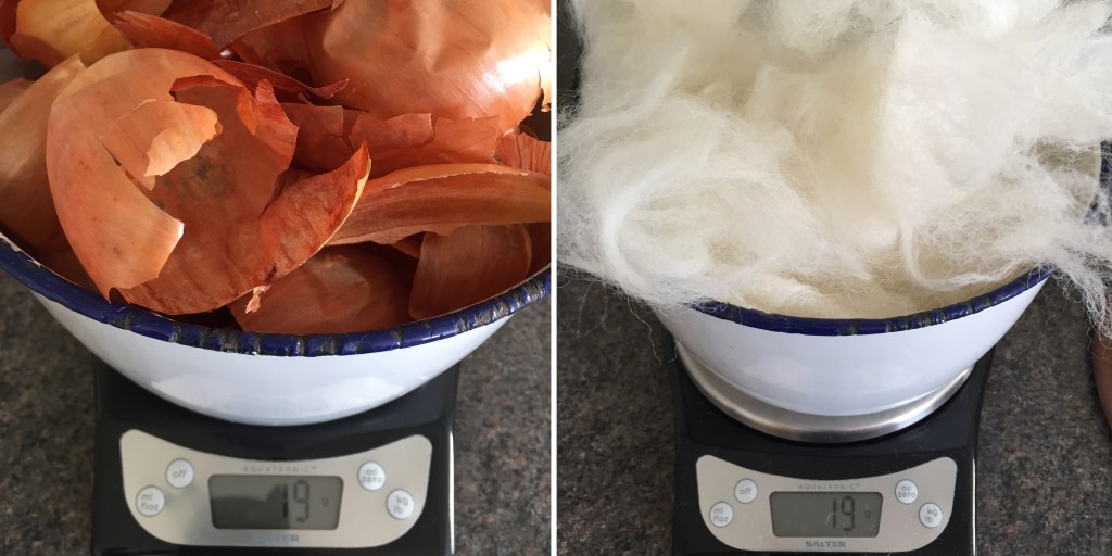First weigh your dry onions skins (we collected ours over a couple of weeks) and then weigh out an equal amount of sheepswool.