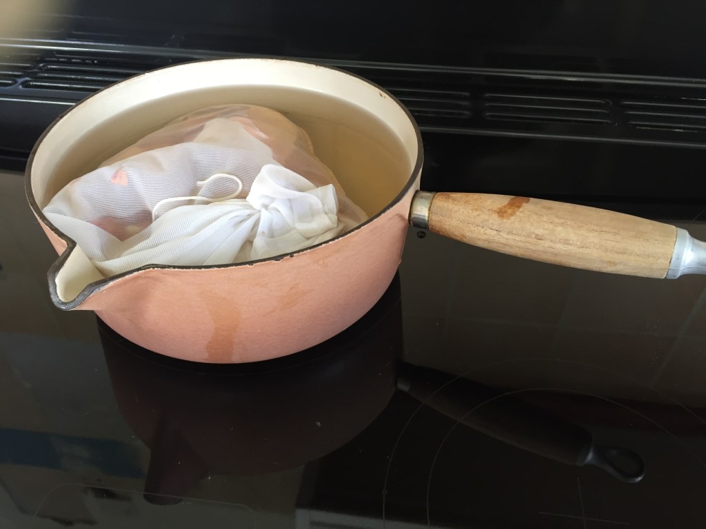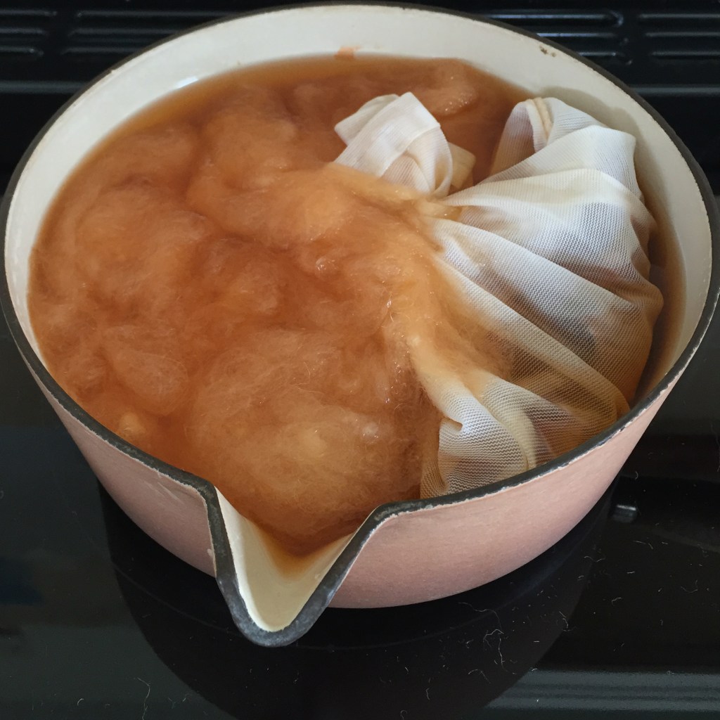 Add the sheepswool to the saucepan with the onion skins in the bag and bring to the boil very very slowly (take about 45mins). Then simmer for another 45 mins.