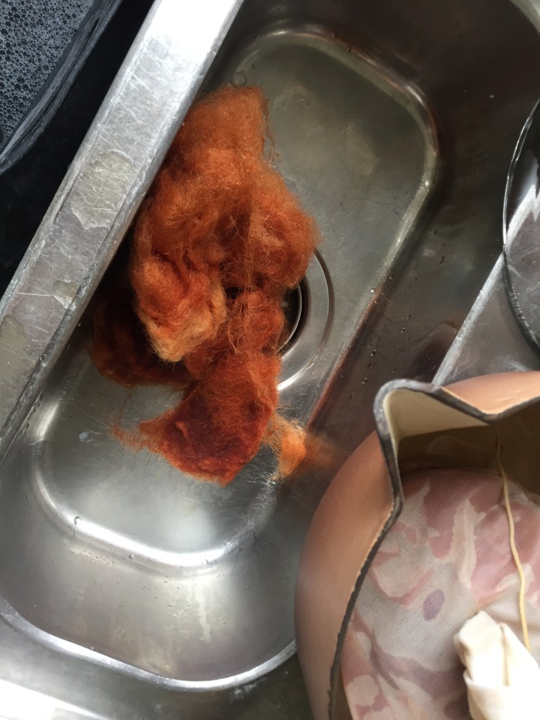 Take the wool out of the saucepan and allow it to cool slowly before gentle rinsing in lukewarm water. Once dry you should have beautifully orange sheepswool ready to make bees!