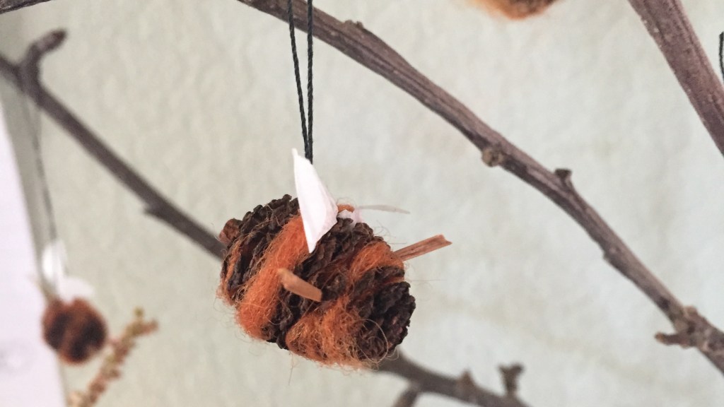 Bees need antennae and we used pine needles cut down to size and poked in the scales of the cone. Anything natural can work – so see what you can find!