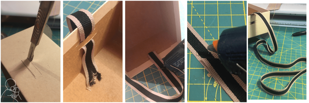 • Finally add the ribbon to the front of your cart. Cut two slits and thread the ribbon through. Glue gun the ends together.