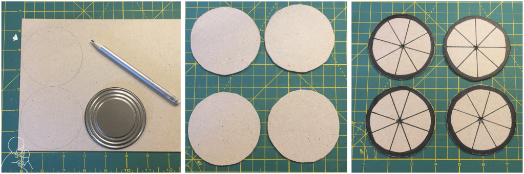• First of all make four wheels. I drew around a tin can lid, cut them out and decorated them with my black marker pen.