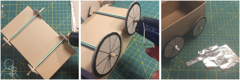 • Now it’s time to assemble the wheels. Using your glue gun stick the washers in place – ensuring that they are set off a little from the edge of the box so the axle can turn freely.
