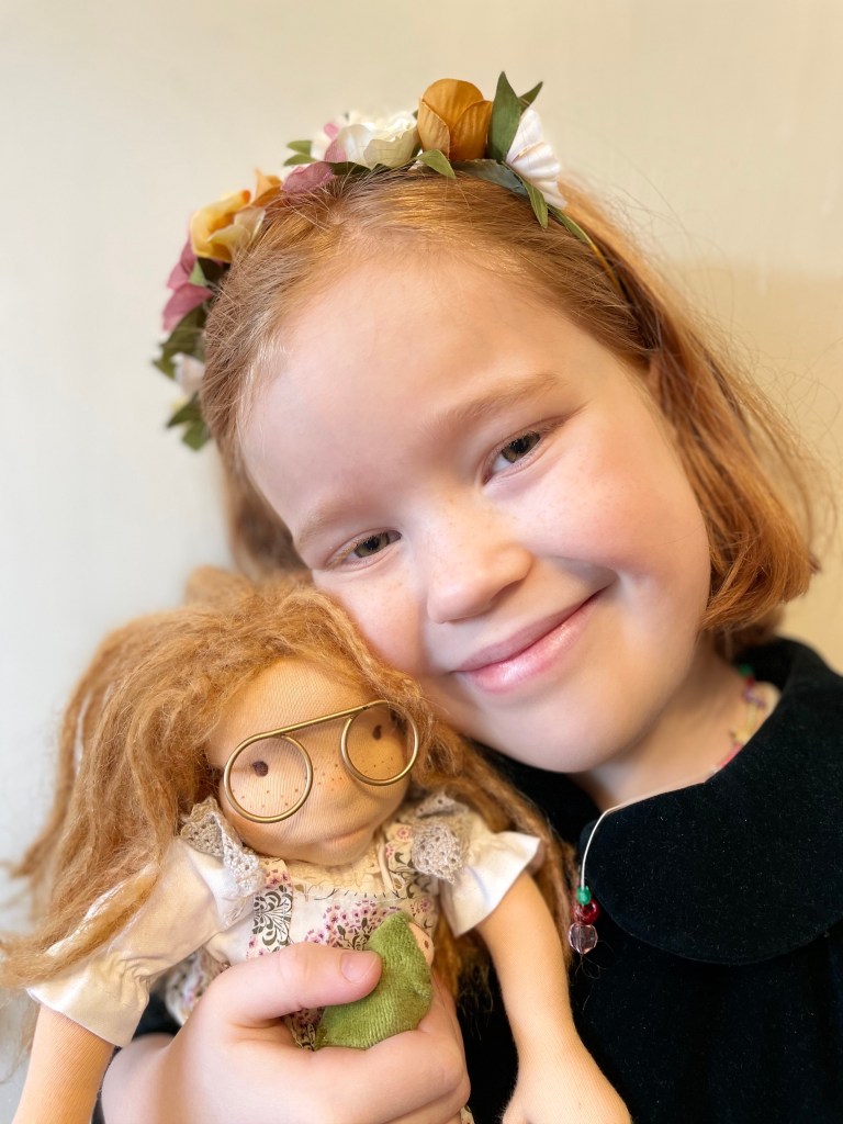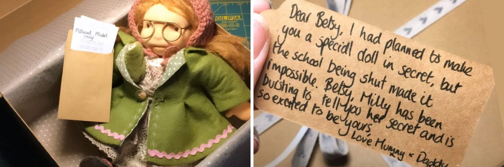During Milly’s creation the schools were closed due to the coronavirus pandemic – it was impossible to make her in secret. My daughter saw her being created and inputted into the process of doll making, without knowing that Milly would be hers. It was such a surprise when she opened the box on her birthday!