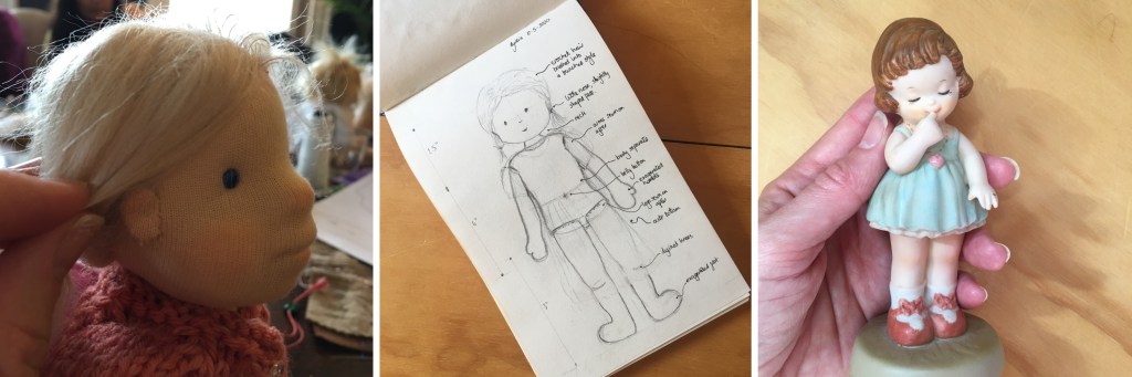 As a trained designer I always start with a sketch. I find it helps me collect my ideas together and gives me a framework to build around. My inspiration was my daughter, a Mabel Lucie Attwell figurine, and my doll that I made with Maria – see Meeting my role model : Maria Asenova.