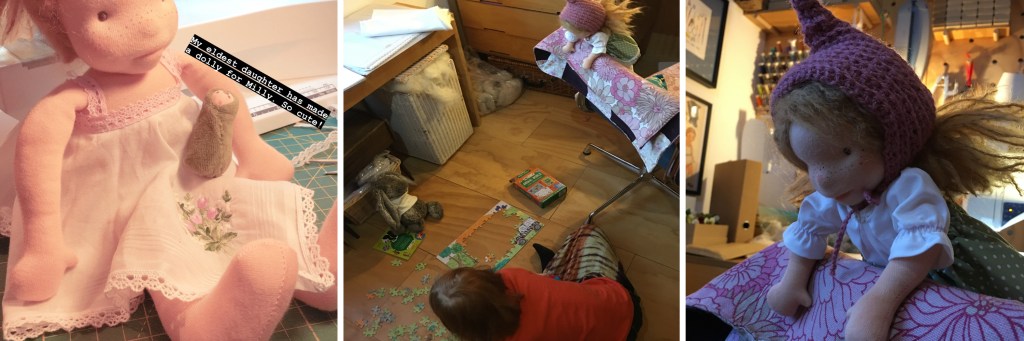 After all the hours of stitching clothes for her, dreaming of her outfits, and (to be honest) playing with her, getting her ready to leave me was quite hard. I knew I had to let her go as it’s no life for a doll to never be played with and sat in my dollmaker’s studio forever, plus my daughter had already fallen in love with her and kept coming in to see what the latest addition to her wardrobe was! At least she is still in the house and I get to see her still.
